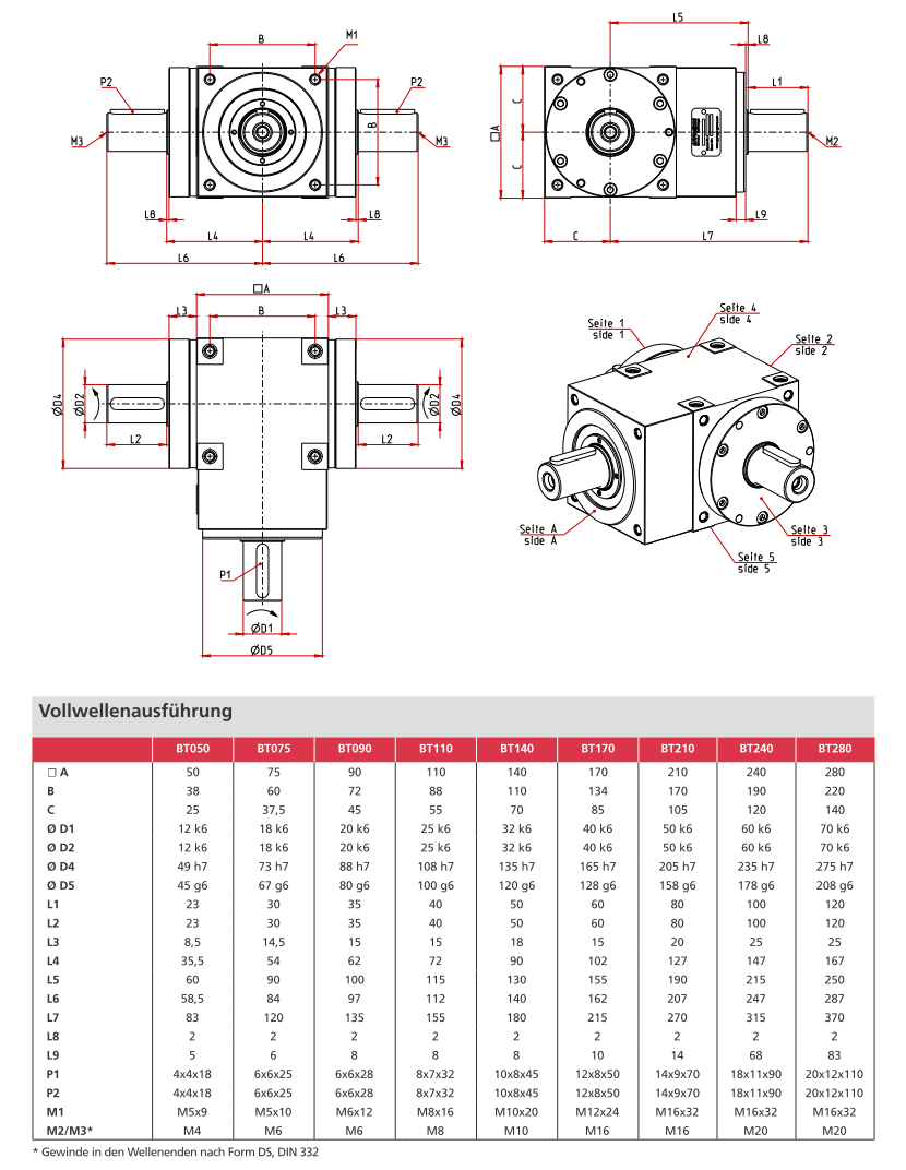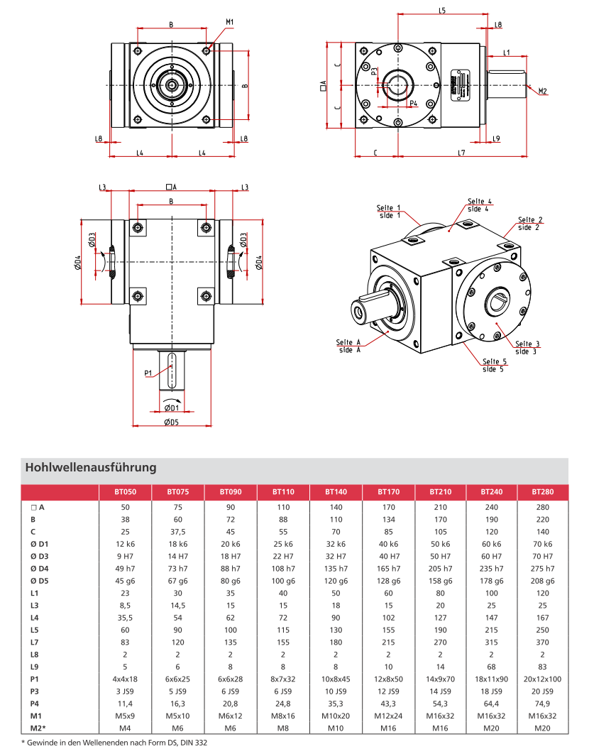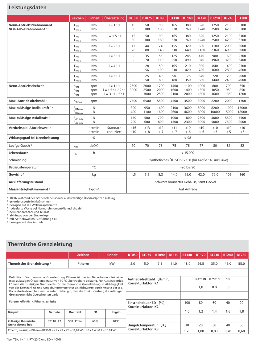 - Baugröße: | 050 | 075 | 090 | 110 | 140 | 170 | 210 | 240 | 280 |(entspricht Kantenlänge des Getriebes)